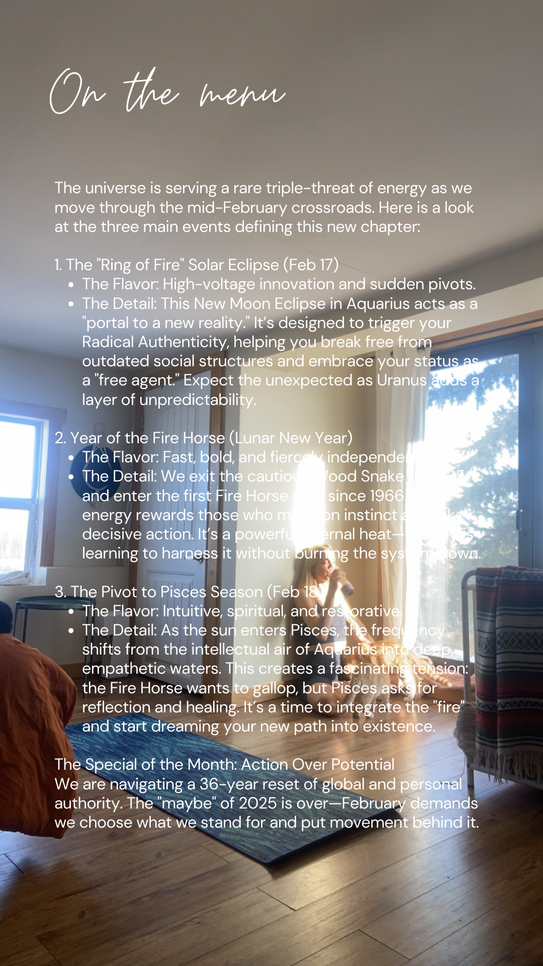 Lunar New Year (Year of the Fire Horse):We officially exit the cautious Wood Snake of 2025 and enter the first Fire Horse year since 1966. This energy is fast, bold, and fiercely independent. It rewards those who follow their instincts without second-guessing.